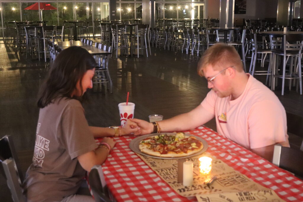 Maddie Walker, sophomore, early childhood major and Charles Loop, sophomore, business management major praying before they eat their pizza.