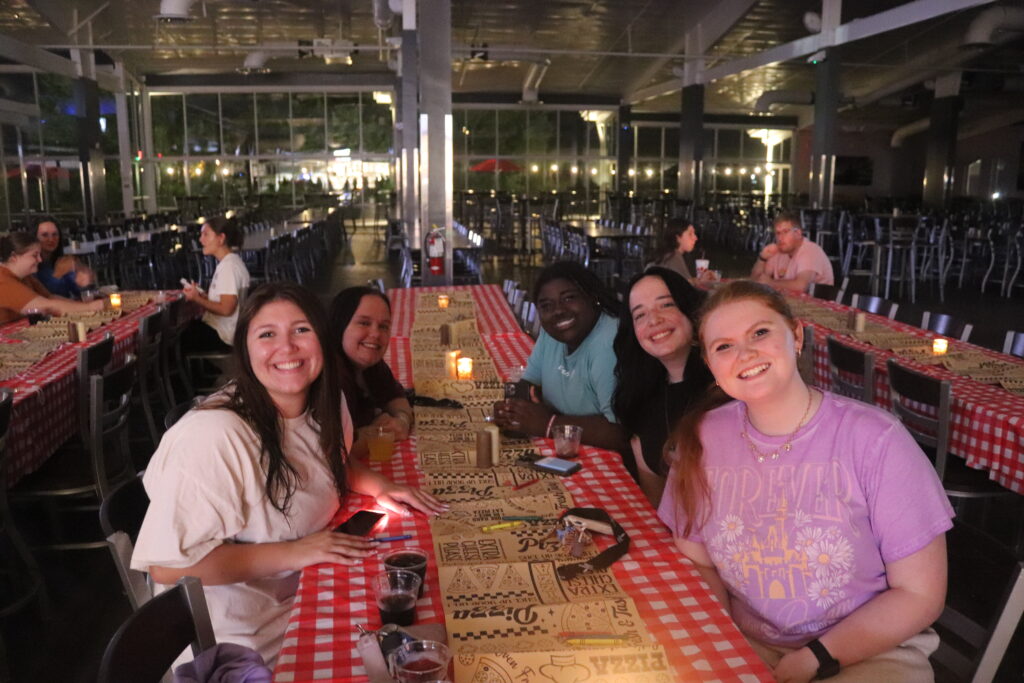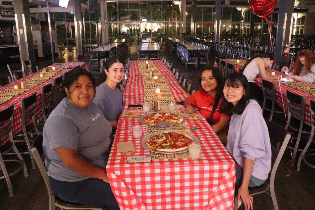 Briana Clemente, freshman, early childhood education major, Analise Franchina, freshman, biology major, Damaris Clemente-Artreaga, freshman, communication major and Sofia Barrera, freshman, criminal justice major attending their first pizza night together as college students.
