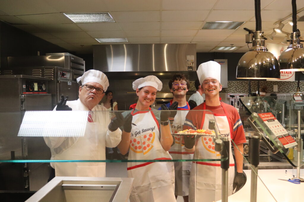 Gene Fant, president of NGU and a group of NGU student life staff members enjoying their time serving the students pizza.