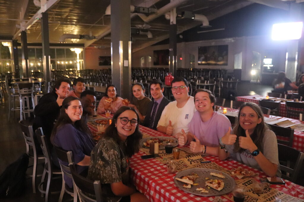 A group of students fellowshipping with one another after enjoying their fresh backed pizza.