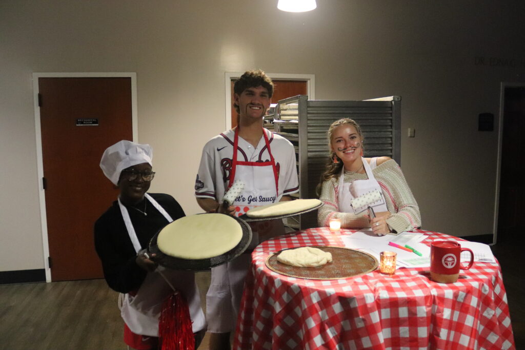Avriel Maddox, sophomore, communication media major, Dylan Peter, sophomore, business management major and Grace Yoder, senior, interdisciplinary studies major working the front checking students into pizza night.