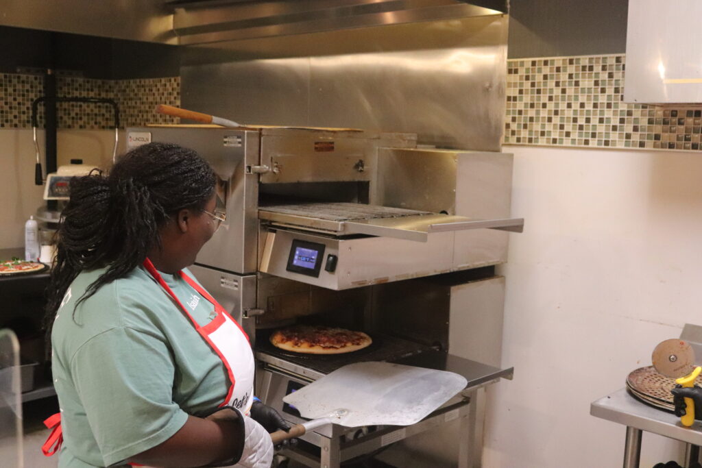 After the students put their toppings on their pizza It gets sent back to the kitchen to be cooked in the oven.