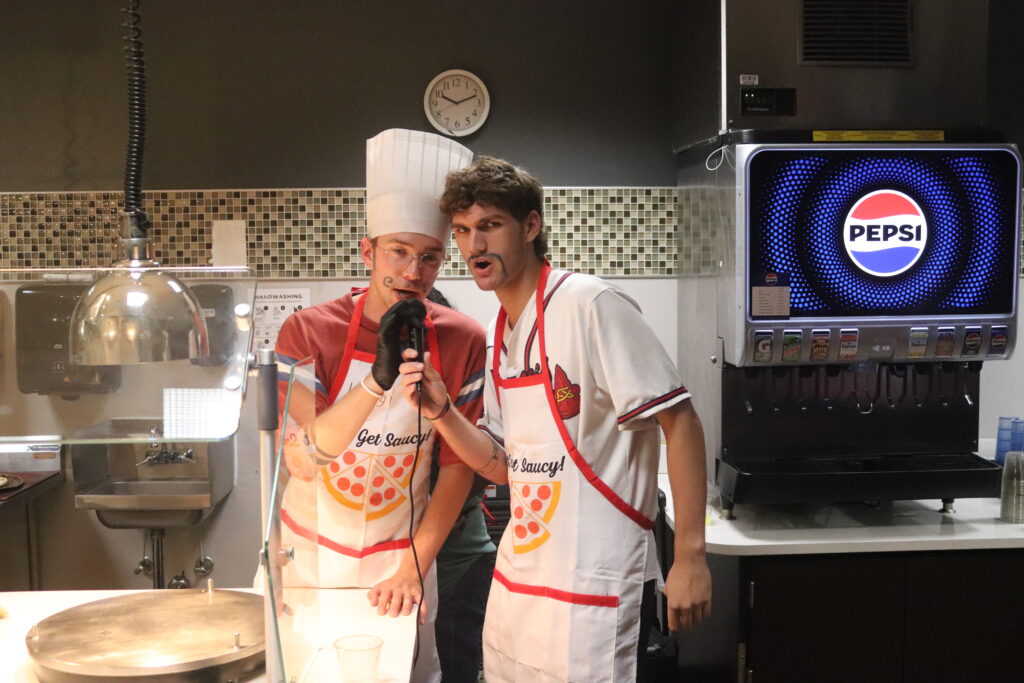 Kaelum Armstrong, junior, Christian studies major and Dylan Peter, sophomore, business management major singing karaoke during pizza night.