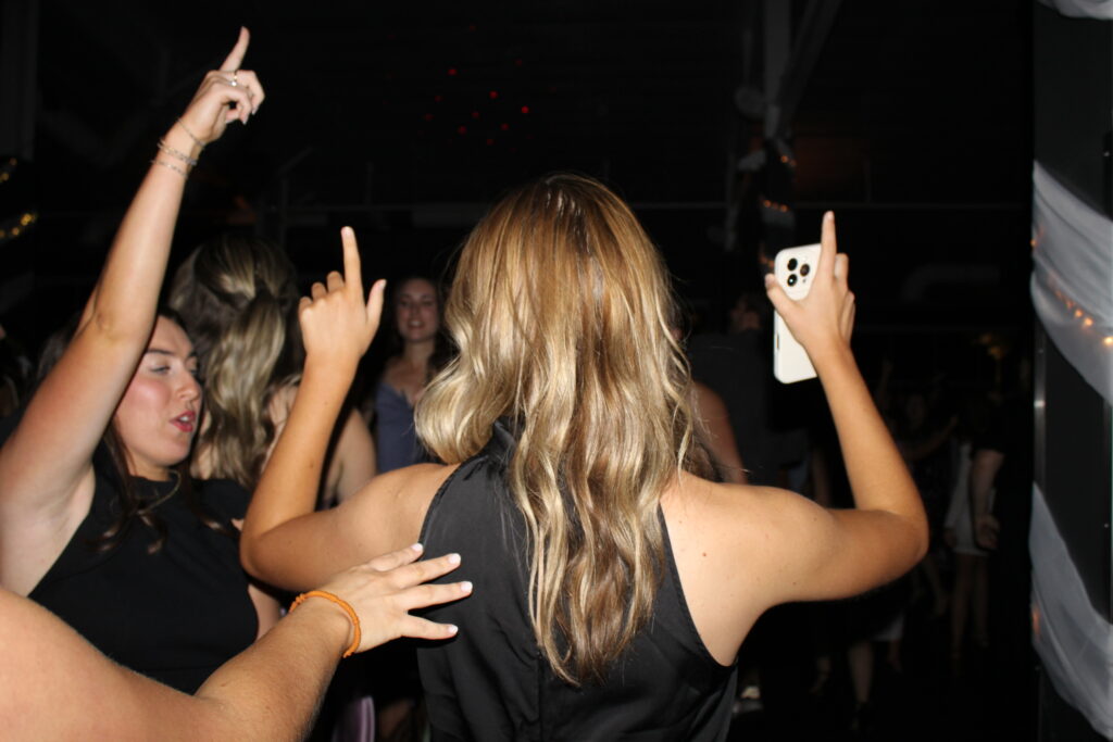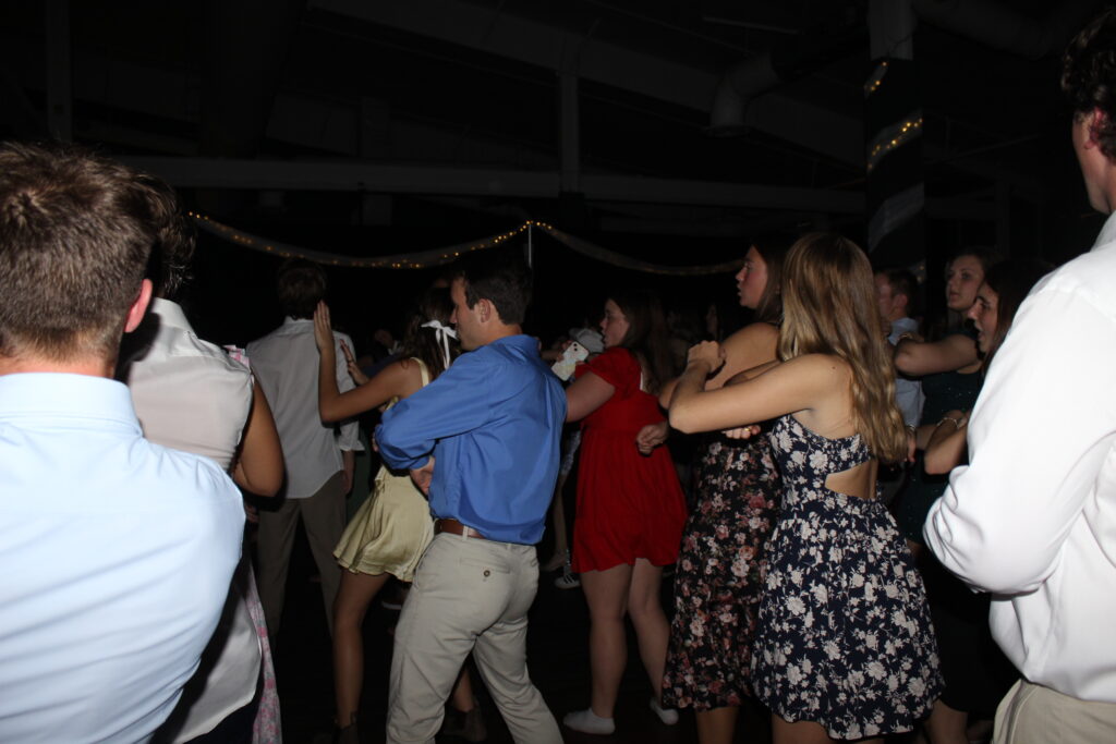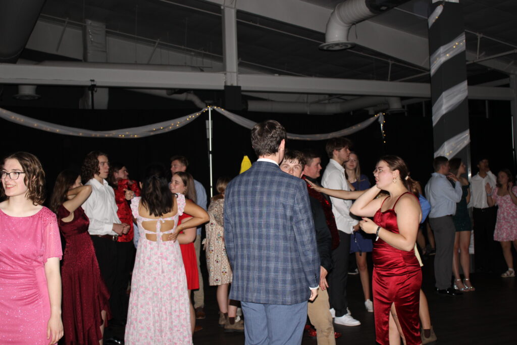 Students wait for the dance to start again after they danced so hard and unplugged the battery the DJ was using for his set-up.