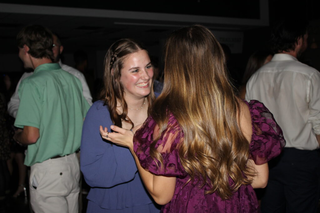Natalie Cannon, junior intercultural studies major and Lauren Fisher, senior elementary education major, catch up and compliment each other’s dresses after entering the dance.