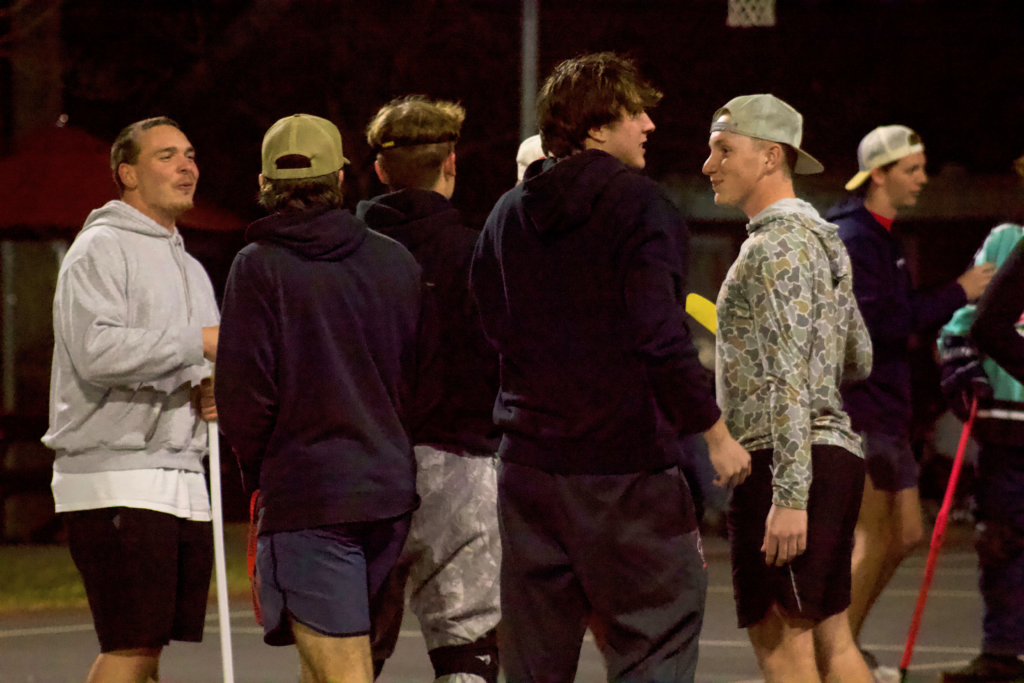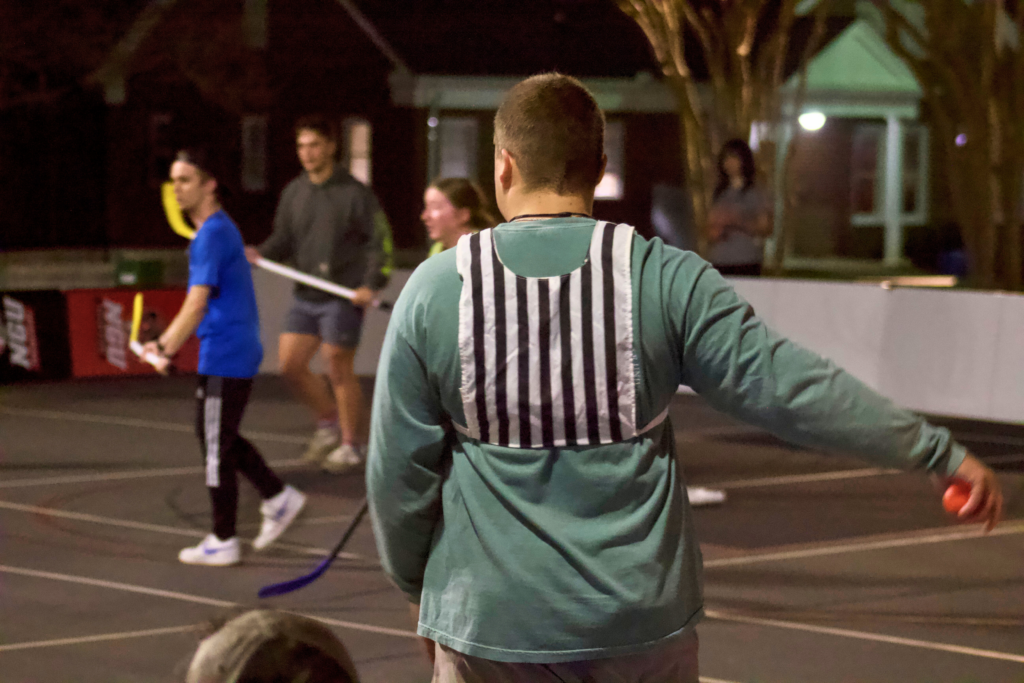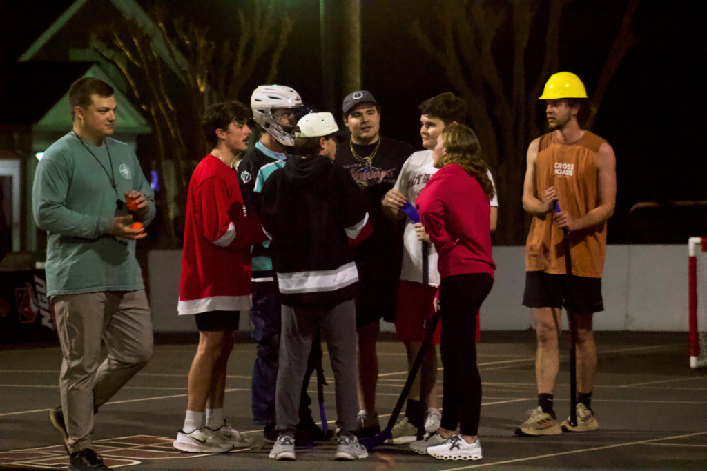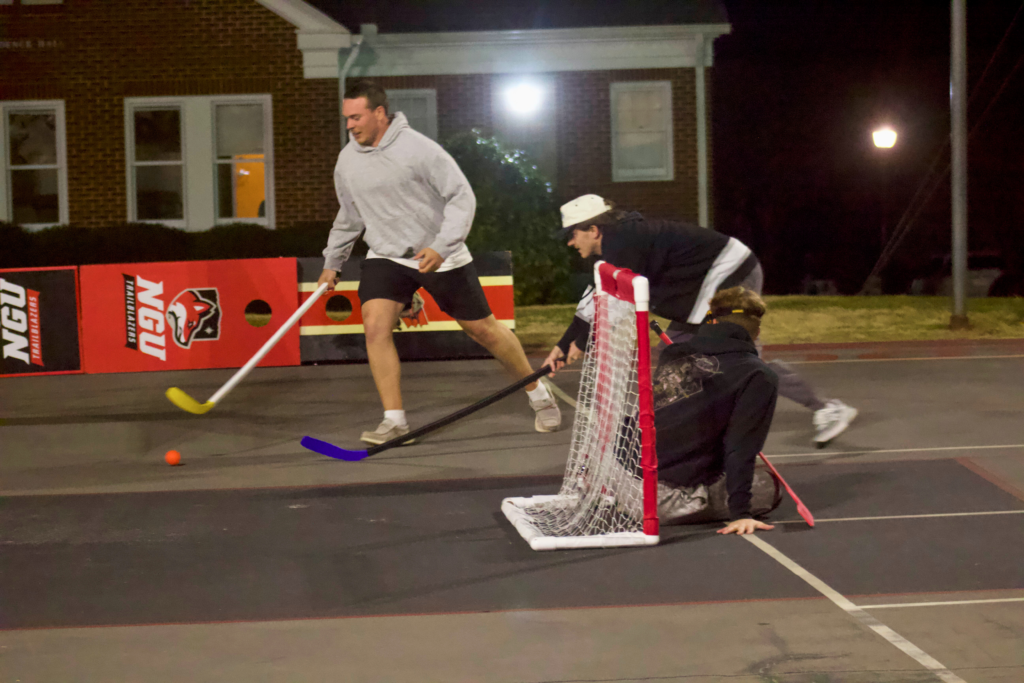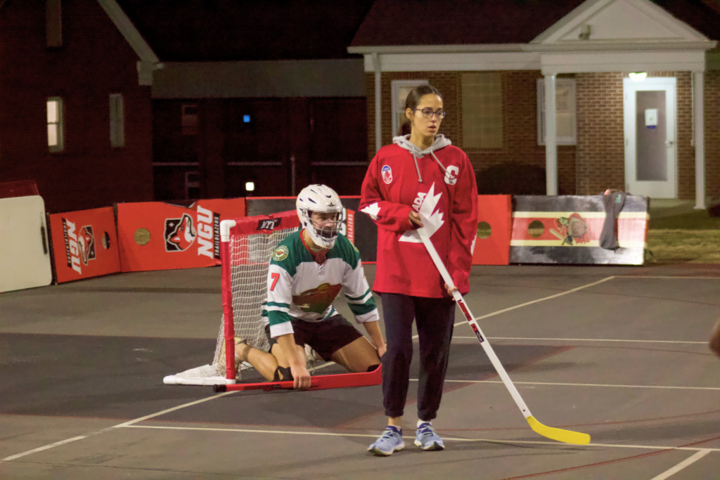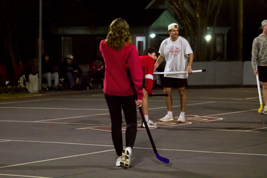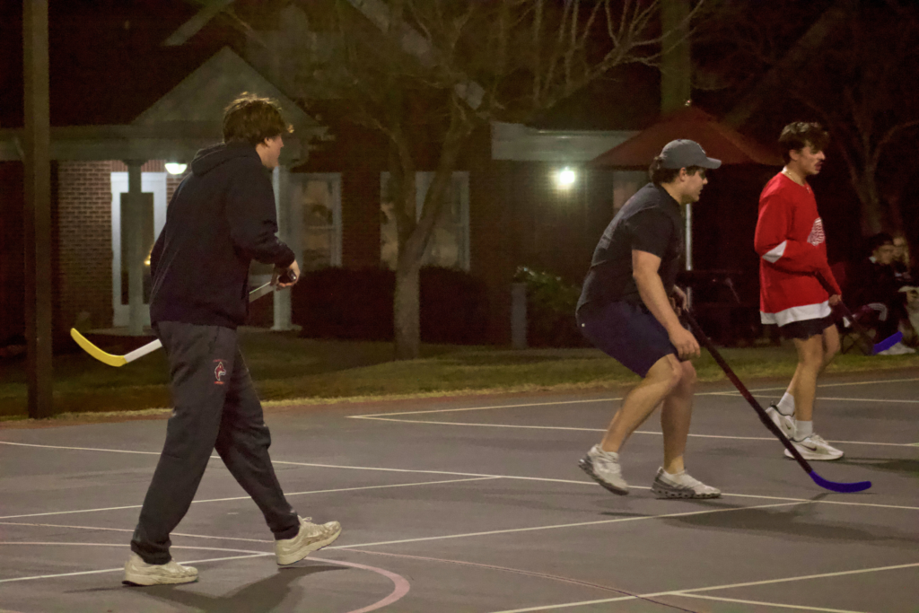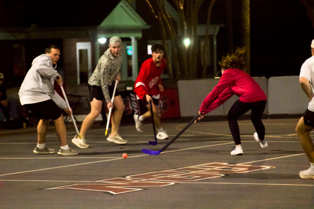 Students compete in intramural street hockey games on campus, using the time to unwind, build friendships and stay active outside of organized sports.